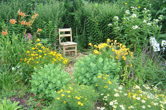This yard sale chair not only makes an interesting focal point in the garden, it also provides a place to sit immersed in flowers.