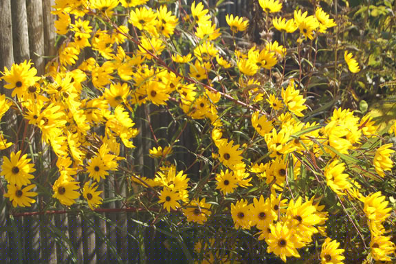 Just when you think your perennial flowers are done for the season, this massive native perennial sunflower burts into bloom in October, and is covered with these golden yellow flowers.