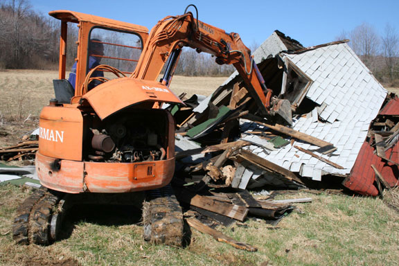 Things can get ugly sometimes when you are renovating a rural landscape. Here my backhoe assistant is demolishing a nasty little barn that we pushed into a pile and burned