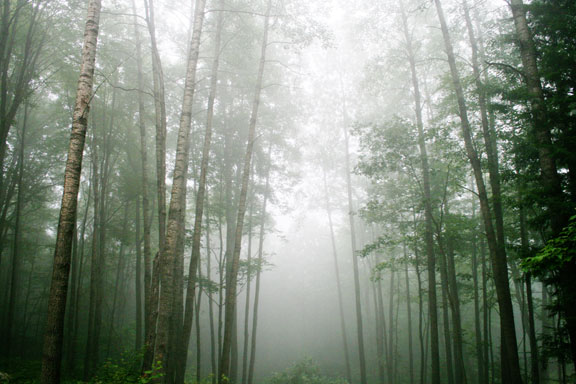 These quaking aspen trees in the fog mysteriously look like bamboo plants.